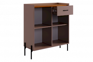 С другой стороны комод оборудован выкатным ящиком, который обеспечивает легкий доступ к часто используемым предметам. Под ним расположен большой глухой фасад, скрывающий за собой просторное хранилище для более крупных вещей.