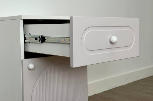 Модель оснащена выкатным ящиком на шариковых направляющих, обеспечивающих плавный и надёжный ход. В нижней части расположено отделение с распашной дверцей, которое подойдёт для хранения книг, игрушек, аксессуаров или текстиля.